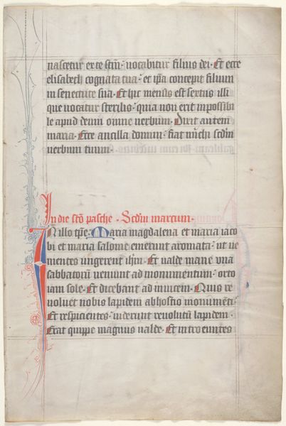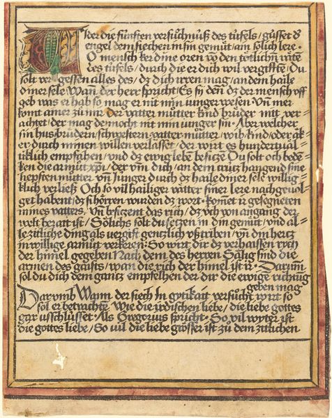 Curator: Looking at this medieval drawing entitled "Salva me," created with ink on paper, I’m struck by its immediate intimacy despite its age. It feels so personal. Editor: Indeed. The calligraphic script and Romanesque letterforms speak to a specific visual culture, a world steeped in religious ritual and monastic study. I wonder about the implications of its textual plea for salvation. Curator: Yes, and observe how the prominent initial letters, colored a warm red, command attention. The large “S” in particular is almost figurative. What do you make of its placement at the very start of this prayer? Editor: The "S" could represent the self, the individual voice crying out. I see it also as a potential reflection of the socio-political contexts of that time, marked by societal hierarchies that perhaps made expressions of individuality complicated and rare. Curator: Perhaps, or maybe that "S" anchors us within a long tradition of illuminated manuscripts—echoing centuries of faith expressed through image and text. It’s about the cultural memory embedded within those artistic choices. Editor: But it's also about the agency of the writer—their choice of words, their way of shaping a prayer. There’s a raw vulnerability on display. Look at the lines: “my throat is hoarse… my eyes have failed, while I hoped in my God." We hear the despair. Curator: It feels universal doesn’t it? Anyone, regardless of time, can relate to the feeling of needing saving. What a thought; that this little drawing becomes an enduring visual testament to that desire. Editor: Ultimately, for me, the power in this piece emerges not just from faith, but its intimate human dimension—captured in faded ink on aged paper and rendered enduringly resonant to viewers so many centuries removed. Curator: Well said. To me, this piece bridges the personal and the universal, weaving a story of longing, a timeless quality captured for a breath through its iconography and presentation of this devotional subject.