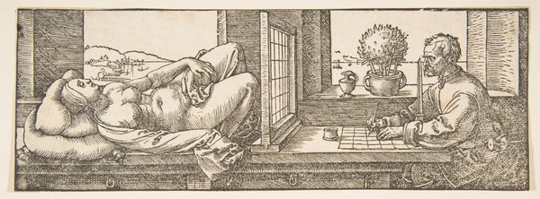 "Abimelech Sees Isaac Caressing Rebekah" was etched by Orazio Borgianni around the early 17th century. The architectural setting, articulated with sharp, decisive lines, creates a stage-like space where the intimate scene unfolds. Notice how Borgianni uses the contrast between light and shadow to direct our gaze. The radiant light from the window not only illuminates the figures of Isaac and Rebekah but also casts long, dramatic shadows that add depth and tension to the composition. This use of light and shadow, or chiaroscuro, is not merely decorative; it serves to highlight the voyeuristic nature of the scene, with Abimelech peering from above. The structural elements—the stark lines of the architecture, the geometric precision of the steps, and the linear perspective—create a sense of order and rationality. Yet, this order is destabilized by the emotional complexity of the scene, resulting in a dynamic interplay between form and content. The tension created invites us to explore the underlying themes of deception, desire, and revelation.