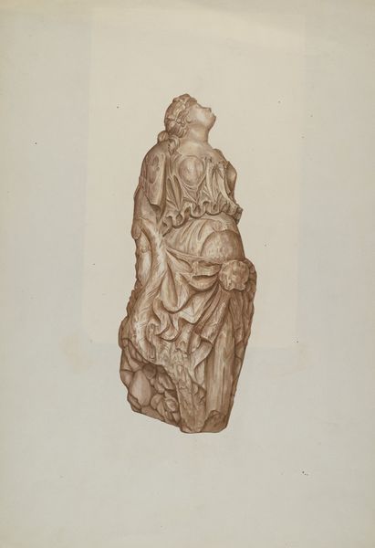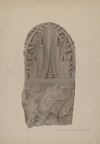 Editor: We're looking at Rose Campbell-Gerke's "Stone Gate Post," from around 1939, which seems to be rendered in charcoal and possibly depicts a sculpture. It strikes me as a study in contrasts – the rough, unfinished base against the ornate carving on top. What are your initial thoughts about this work? Curator: The division is immediately striking. One might deconstruct it by examining the stark contrast between the textured, almost raw materiality of the base and the calculated, almost effervescent floral carvings that surmount it. The geometric architecture implied in its structure finds playful juxtaposition within the soft carving motifs. Editor: So you see it as a dialogue between two distinct artistic intentions? How does the medium contribute to that reading? Curator: Precisely. Note how the charcoal medium is used. On the lower register, its application conveys the mass and tactility of roughly hewn stone, whereas it offers a sense of airy lightness above. The lines become lacework, further emphasizing the textural contrast and the play between solidity and permeability. Is there something specific that draws you to it? Editor: I appreciate how the artist uses line to differentiate form, yet also create a sense of continuity, particularly in the spiraling designs. Is this tension something the artist often explores? Curator: It would necessitate further investigation into Campbell-Gerke’s oeuvre to state that definitively. However, consider that the upward spiral—found repeated atop—implies growth and ascension. Conversely, the cube itself serves as grounding, suggesting a deliberate discourse regarding permanence and mutability. Editor: This gives me a richer understanding of the interplay between form and material within the artwork. Curator: Indeed. Formal analysis brings awareness to these critical qualities and allows us access into how art functions as art, as well as culturally and historically.