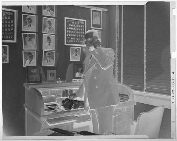 Curator: Jack Gould’s small gelatin silver print, "Untitled (man sitting at desk reading paper and eating sandwich)," now held at the Harvard Art Museums, presents an intriguing moment of everyday life. Editor: It strikes me as both cozy and chaotic. This man, sharply dressed, but surrounded by papers and half-eaten food – there's a relatable tension there. Curator: The image suggests a particular kind of mid-century masculinity – the busy professional, caught between work and leisure. Note the framed portraits in the background. Editor: Yes, who are these guys staring down at him? They almost feel like a jury judging his ability to juggle it all. The sandwich, the paper…it's a potent mix of ambition and appetite. Curator: Considering the social context, the image speaks to postwar ideals of success and domesticity, perhaps with a hint of the pressures those ideals created. Editor: I'm left feeling for him, really. It's a small picture that hints at big struggles of trying to find balance. Curator: Precisely. Gould’s photograph provides a valuable look at the constructed realities of a certain era. Editor: It's a little reminder that even in the most composed images, the mess of life peeks through.