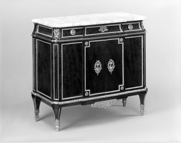 Curator: This elegant commode, or cabinet, was crafted between 1780 and 1790. The artistry of Adam Weisweiler shines through in every detail. Editor: My immediate impression is one of restrained elegance. The rectilinear form and symmetrical design evoke a sense of order and classical harmony. It’s quite austere. Curator: Precisely. Weisweiler was a master of Neoclassical design. Note the careful balance, the restrained ornamentation. The commode features a marble top, with a body constructed of wood, enhanced by carving and sculpture. Editor: And it's that interplay of materials – the cool, hard marble juxtaposed with the warm, textured wood – that I find particularly compelling. The labor invested here is clearly very significant; this was built, I presume, by more than a single set of hands. Curator: Indeed. The commode represents a confluence of skilled labor. Think about the carving, the joinery, the polishing – all separate crafts converging. We must appreciate the coordinated efforts and conditions necessary to produce such a piece. Editor: Absolutely, I'm always thinking of production; its social context is critical. However, considering it solely as a functional object feels inadequate, doesn’t it? Its very form transcends utility, reaching toward something...more symbolic? The rigid frontality and proportions imply deeper concepts of status and control. Curator: Certainly. And in this object, we see the apex of craft. The meticulous execution of line, shape and material displays the prevailing formal theories of the time. Editor: It’s truly impressive how a seemingly simple form embodies such a depth of artistic intention, not just aesthetically, but economically. It reflects so much about its epoch. Curator: Indeed, it has provided ample ground for discussion. I leave with a greater understanding of how Weisweiler blended formal elegance with the social currents of his time. Editor: Agreed. This experience deepened my appreciation of materiality and process and highlighted labor relations during the rise of neoclassicism. Thank you.