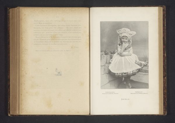 Editor: This is a photograph titled "Portret van Jeanne Andrée," made around 1880-1885 by Nadar. It's a gelatin-silver print held at the Rijksmuseum. What strikes me most is the way the figure is positioned within what appears to be an open magazine, her pose almost feels deliberately performative. How do you interpret this work? Curator: The inherent tension lies in the interplay of forms. Consider how the geometry of her dress, the ruffles and sharp angles of her hat, contrasts with the more fluid background suggestive of foliage. Note the tonal range, how the silver gelatin creates subtle gradations, almost evoking an ethereal quality. This isn't simply a document of likeness; it's a careful construction of shapes and values. Editor: It’s interesting you mention that tension. Does that make you see her expression, maybe a coy defiance? It is reflected, formally, by that juxtaposition? Curator: Precisely. The perceived defiance you speak of arises directly from Nadar's compositional strategy. The gaze, in conjunction with the formal properties—the deliberate positioning of limbs, the manipulation of light to accentuate certain features—creates a visual tension, and an interpretation of defiant performance. What does that imply to you, given the semiotic possibilities of portraiture in the 19th century? Editor: I see what you mean. Before, I didn't focus on that manipulation as creating a feeling, but saw it more literally. It gives me a new appreciation for how photography moved past documenting. Curator: Indeed. It underscores photography's power as a constructed art form, capable of evoking a complex range of meanings beyond mere representation. Editor: This exploration gave me more appreciation for how technical considerations shape interpretations in photographs.