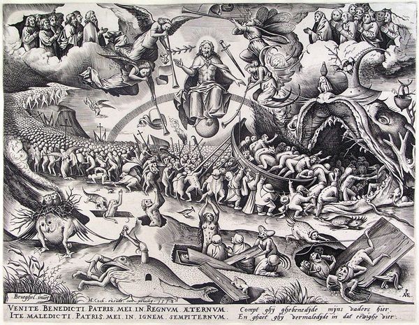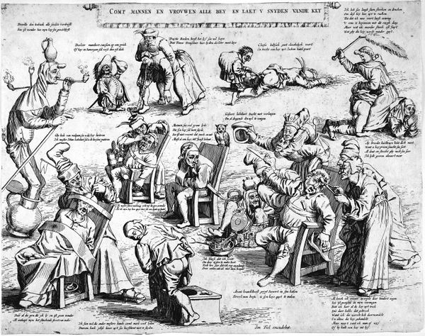 Curator: I’m immediately drawn into this chaotic vortex. It feels like a carnival gone horribly wrong, a dark parody teeming with…are those demons? The overall tone feels satirical, but with a very uneasy edge. Editor: You've keenly observed that unsettling energy! What we’re looking at is an engraving titled "The same God so that he obtained of the Magus was by demons be pulled in pieces" after Pieter Bruegel the Elder. It's a fascinating work that draws on allegorical and symbolic traditions to communicate themes tied to Christianity and morality. Curator: "Pulled in pieces" is certainly the feeling I get! I see this jumble of figures, half-human, half-beast, engaged in all sorts of bizarre activities. Upside-down bodies, creatures with odd proportions—it's a riot of the grotesque. But there’s got to be more than just chaos here. What about the woman on the right near the entrance? Editor: Indeed! The central figure represents Saint John Chrysostom, known for his powerful sermons. He’s casting out these demonic influences that have taken root within society. The imagery echoes older themes, the temptation of St. Anthony, which emphasizes human virtue versus demonic corruption. Curator: I see. So the figures, seemingly absurd, might be symbolic representations of human folly or moral decay? I notice one figure wearing a bishop’s hat! It sounds like a criticism on power or institutions gone wrong. Editor: Precisely! Bruegel was a master of embedding complex messages in seemingly simple scenes. Consider how the architecture shifts—from interiors to a distinct opening with pious observers looking out—drawing a contrast between corruption and goodness, which helps reveal those moral underpinnings you detected. Curator: And this complexity—I love how it encourages me to slow down and unravel meaning from layers of symbolism, not unlike a psychologist diving deep to understand human complexities. What about the artist? Editor: Bruegel's innovative blend of realism and fantastical elements makes the viewer participate, and confront unsettling truths beneath the façade of everyday life. "Medieval Surrealism!" Curator: What a wild world Bruegel created here. It really makes you consider the demons— both literal and metaphorical—we allow into our lives, into our societies, doesn't it? Editor: Precisely, and a fitting image to linger with, as we continue through the exhibit!