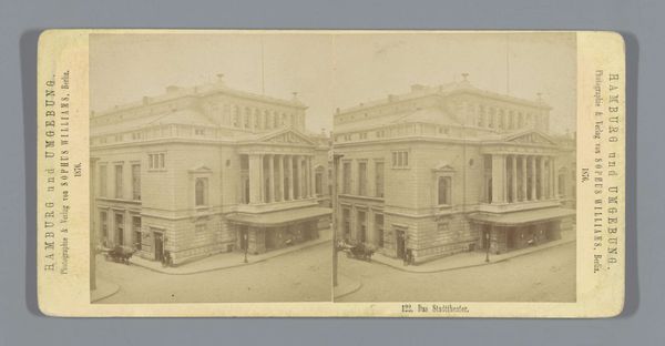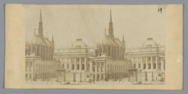 Curator: Welcome! We're standing before "Gezicht op de kapel van het paleis van Versailles," or "View of the Chapel of the Palace of Versailles." This is a photograph, most likely a print, created by Ernest Eléonor Pierre Lamy, circa 1860 to 1880. It's quite interesting because of the way photography captured architectural details in that era. Editor: Gosh, the sepia tone just blankets everything in nostalgia. It’s like seeing a memory. You can almost hear the echo of carriages in that vast courtyard! And the light, it seems to glorify every baroque curve. Curator: Absolutely. And those curves were costly! One key element often overlooked in works like this is the social and economic investment it embodies. The materials themselves—stone, glass, lead—and the sheer labor power needed for such a monumental project reflects enormous resources concentrated within a specific class. Not to mention the photographer's own studio and equipment to capture this very image. Editor: Yes! Looking at it this way, it really emphasizes the disparity. It's grand, obviously, but also… excessive? I almost feel a little uncomfortable with that much visual and material wealth. And seeing it in photograph, something that was becoming accessible to more people, gives that contrast a real bite. Curator: Indeed. Early photography democratized art by making images readily available, which altered not only production but art consumption as well. By making buildings like this Chapel visually accessible, it was inevitably available to broader judgment, to which the Royal occupants may not have been as accustomed. Editor: It's funny to think how easily we access these kinds of images today with our phones, it's easy to miss the kind of cultural shift something like this image triggered back then! Curator: It's important to remember the conditions of viewership. Now if you want to consider the materiality... Editor: What strikes me now is how this very particular photographic print becomes an object in itself, a token of an era. I will keep wondering how it was handled back in its own time... Curator: Fascinating points to ponder, wouldn't you agree?