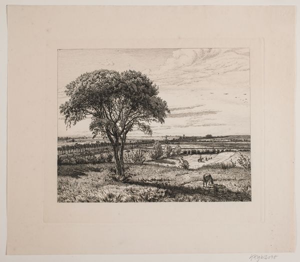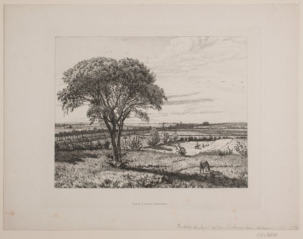 This is Landskab ved Borup, an etching made by Hans Anton Thiele. The scene is rendered through a network of fine lines incised into a metal plate, which was then inked and pressed onto paper. Look closely, and you can see how the varying density and direction of the etched lines create a sense of depth, light, and texture. The clouds, the trees, and the distant horizon are all evoked through the careful manipulation of this essentially linear medium. Etching, like other printmaking techniques, democratized image production in the 19th century. It allowed for the relatively easy reproduction of artworks, making them accessible to a wider audience. But it also required skilled labor: the preparation of the plate, the careful etching process, and the printing itself. In Thiele's work, we see both the potential for mass production and the lingering presence of the craftsman's hand. By considering the labor involved, we gain a deeper appreciation for the artist's skill and the social context in which this landscape was created.