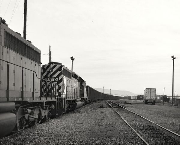 Curator: Michael Mathers' black and white photograph, "Untitled (birds over train yard)," presents a poignant juxtaposition. Editor: Stark. The repetitive verticals of the train cars almost imprison the viewer, yet the birds suggest freedom. Curator: The image captures a moment rife with the implications of industrial infrastructure and its impact on the environment, further emphasized by the birds. Editor: Right, the textural gradient from the rough foreground to the smooth sky is a key visual element of Mathers’s composition. Curator: Indeed, the placement of the birds in the sky is especially strategic to guide the eye across the frame, almost to distract from the train yard. Editor: It works. It’s as if he’s offering a glimmer of hope amidst the harsh realities of industrialization. Curator: It’s a commentary on the times. A reminder of the tension between the natural world and human progress. Editor: And structurally, the birds lead the eye upwards, defying gravity. The photo feels very dynamic, despite the static subject. Curator: Well, it certainly gives us much to consider about our own perceptions of progress and nature. Editor: I find it visually compelling, its contrasting elements stay with you long after you’ve moved on.