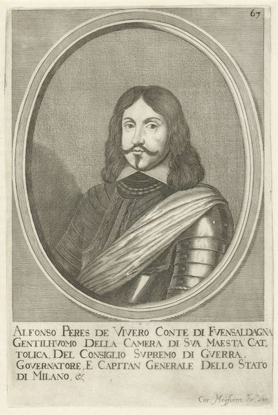 Curator: Gazing up at this Baroque engraving, "Portret van Ranuccio Farnese II, hertog van Parma en Piacenza," done sometime between 1660 and 1685, I can't help but wonder about the life and times of such a titled noble, his story almost vibrates off this artwork made with simple line engravings. Editor: Well, my first impression is that the armor suggests power, yes, but also constraint, or perhaps anxiety. What burdens did Ranuccio carry? The etching has a somberness that almost feels oppressive. Curator: Absolutely. And the level of detail that artist Johann Martin Lerch achieved with simple tools is really captivating, every curl in Ranuccio's hair seems to tell us something. Think about the context: a duke caught between shifting alliances, always scheming… he ruled over others who suffered because of his position. Editor: And perpetually trying to solidify his power. This image presents him as a figure embodying Baroque absolutism, but, more cynically, it also normalizes these inherited, undemocratic power structures. It also strikes me that his heavy ornamentation and rather vacant stare serve to communicate an inherent emptiness, or lack of individuality. Curator: Precisely, this is also part of the story of European history, the artist using visual representation to tell us that there were many victims on either side of this legacy. You feel trapped simply observing. Editor: And that necktie, which might look decorative now, almost acts as a metaphor for strangulation under all those layers of obligation. He is imprisoned, just like others are. And the weight, of it all… that kind of inherited role leaves you paralyzed in place, doesn't it? A bit like gazing at your portrait for years and centuries in a row. Curator: Absolutely. It also reminds me of how art itself, even something seemingly straightforward like this portrait, can be such a battleground of interpretations, filled with so much hidden feeling. Editor: Indeed, so many contradictions folded neatly in lines of engraving. I am grateful that Johann Martin Lerch's print encourages us to question power and those trapped in its endless web, centuries after its making.