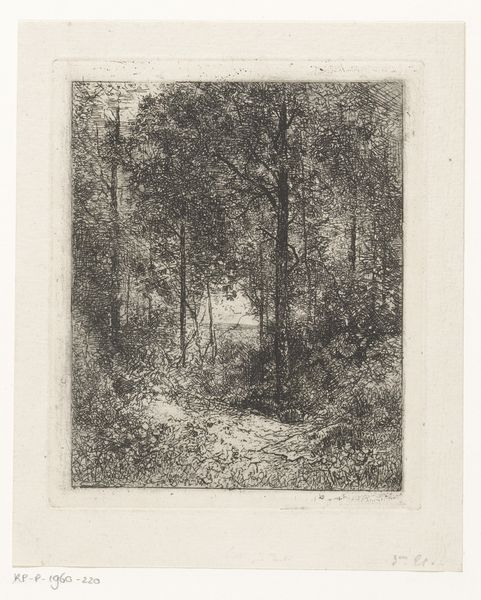 Curator: This is "Fyrreskoven," or "The Pine Forest," an etching by Niels Skovgaard, created in 1883. Editor: Immediately, I see this constrained palette as a stark contrast to romantic visions of untouched wilderness. It’s so somber. Curator: As an etching, this work gives us a real sense of the labor involved in producing the image. We see the results of a carefully controlled process. How the acid interacts with the metal plate dictates the final appearance. It removes some of the artist’s hand. Editor: But the absence of vivid color might be speaking to the limitations imposed upon rural communities in Denmark at the time. Consider the environmental precarity experienced by forest dwellers and workers during industrialization. What were their lives like as the landscape around them transformed? Curator: The composition reinforces that industrial reality through Skovgaard’s commitment to realism, even though some could see its aesthetics are rather melancholic. The image gives viewers a feeling of the sheer amount of physical labor demanded by managing natural resources, and the act of consuming these goods at an increasing rate. Editor: And what of the trees themselves? Aren't they symbolic? As upright forms rooted in the earth and reaching for the sky, they resonate with patriarchal power structures and our culture's complicated relationship to nature. It’s also tempting to connect them with notions of national identity, given Skovgaard's focus on local landscapes. Curator: Right, you’re urging us to move beyond surface-level appreciation, which often neglects to reflect on the political and societal structures from which art arises. I think focusing on the means of production emphasizes how it brings these narratives into the world. Editor: Exactly! I hope discussions such as this help to broaden the view. To consider both the artistry and the wider world around it. Curator: Ultimately, it's the link between those areas that make analyzing work like this interesting.