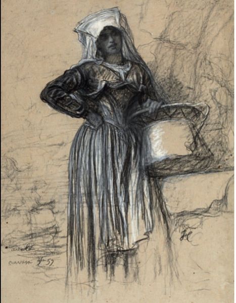 Editor: Here we have John Singer Sargent's watercolor, "Young Woman with a Black Skirt," dating from the early 1880s. It’s… striking how quickly it's rendered, but she still has a very strong presence. It almost feels like she was caught in a fleeting moment. What do you make of it? Curator: Oh, I find it utterly enchanting! You know, Sargent had this incredible ability to capture not just a likeness, but a feeling. The way he suggests the texture of the fabric with such economical brushstrokes, almost a whispered suggestion rather than a declaration, speaks volumes. She's there, yet she's ephemeral, a dreamlike figure in a wash of color. Editor: I hadn't really thought of the 'dreamlike' quality, but I see what you mean with how light and airy the background is, compared to the weight of the skirt. Why watercolour rather than oils? Curator: Ah, a fabulous question! Watercolor lent itself beautifully to Sargent's desire for immediacy. Oils can be labored, considered; watercolour feels spontaneous, reflective of that "fleeting moment" you intuited. And note how the paper itself becomes part of the composition—it breathes! A watercolour, particularly of a young woman, might embody this transience better than more worked forms. Does the way it dissolves into the page affect your sense of the sitter? Editor: Absolutely! It definitely makes her feel less… concrete, I guess? More of a memory or an impression. I see it now. Curator: Precisely! Art is a tricky play between seeing and *feeling*. Sargent coaxes us to consider both in equal measure! What a trickster. Editor: I love the subtlety of the emotion captured. There’s such confidence in every brushstroke. Thanks. Curator: Indeed! The way Sargent utilizes spontaneity is the soul of the work! Thank you for sharing this perception.