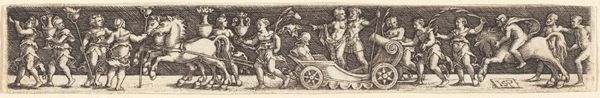 Editor: Here we have Monogrammist AC's "Triomfwagen," created sometime between 1520 and 1562. It's an intricate engraving. The eye is immediately drawn to this almost parade-like scene… quite fantastical and a little chaotic. What is your reading of this artwork? Curator: This print speaks volumes about the sociopolitical climate of the Renaissance. Images of triumph, drawing from Roman traditions, often functioned as vehicles for displaying power. Consider the composition; it’s not just about celebrating victory, but also about legitimizing it. Editor: Legitimizing it how? Curator: By showcasing not just military might, but also cultural sophistication and the 'divine right' to rule. Note how the figures are idealized, almost allegorical. How does this idealization speak to broader issues of identity and representation in that period? What about its cultural impact? Editor: So you're saying it's less about an actual event, and more about constructing an image of authority? The idealization is a form of propaganda? Curator: Precisely. Look closely at who is included, and who is conspicuously absent. The narratives being woven here uphold a certain social order. The classical allusions? It links their reign to this supposedly glorious past. Don’t you think the artist intentionally drew connections between Renaissance power and Roman authority? Editor: I hadn’t thought about it like that, but seeing it as a statement about power shifts my understanding entirely. I’m intrigued by how artists use history to frame contemporary issues. Curator: This piece highlights that the narratives constructed around events are never neutral; they are imbued with power dynamics and the deliberate shaping of identity.