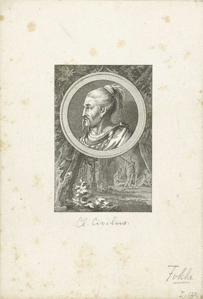 Editor: This is a print from somewhere between 1783 and 1795, "Portret van Brinio, veldheer der Kaninefaten," by Reinier Vinkeles. It looks like ink on paper. I am really drawn to the intricate detail despite the print's relatively small size. How do you interpret this work, with all of its varied line work? Curator: Note how Vinkeles employs the circular frame, or the roundel, a formal device. It isolates Brinio, directing attention to the facial expression, its symmetry reinforced by the centered gaze. Are you responding primarily to the formal characteristics, like the contrasting light and shadow created by the hatching? Editor: Yes, the contrast creates an incredible depth. And what's the significance of the forest scene beneath? Curator: Ah, that leads us into pictorial space and symbolic expression. Notice how that subordinate space grounds Brinio. How might we read that lower scene as not merely setting a scene, but rather symbolizing something of the man himself? His relationship to nature? To authority? Editor: I see. The way the figures seem to melt into the landscape... perhaps that's about his connection to the land. The composition emphasizes the importance of the natural world to the overall theme. Curator: Exactly. Vinkeles seems to be playing with depth and perception but he's making a statement with the relationship of this character with this idealized landscape. Editor: This discussion really makes me appreciate the composition. I had initially thought the forest was only a backdrop, but now I recognize its symbolic weight, and how its interplay with the portrait creates meaning. Curator: Indeed. Looking closely at the visual language, its interplay, is key to unpacking any artwork's complexity.