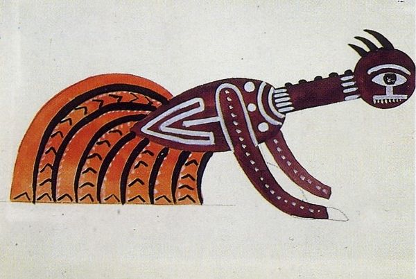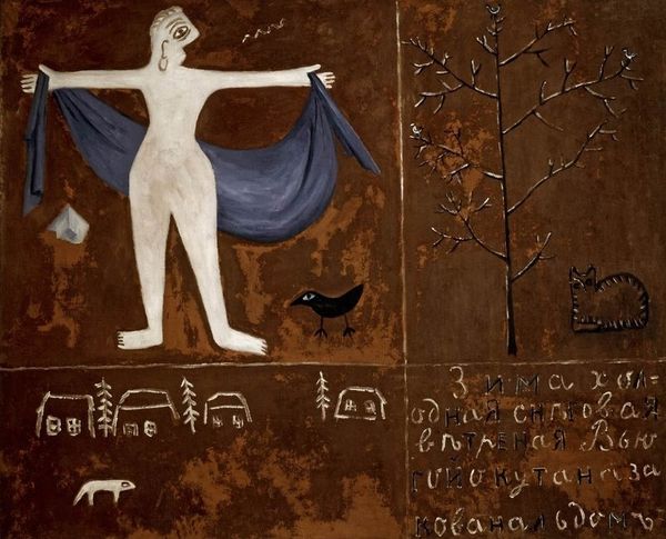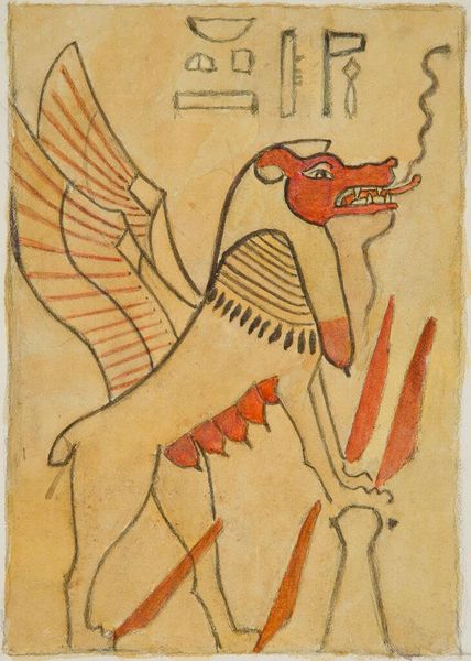 Curator: This haunting image is entitled *Winged Being on Silver Ground*, a 1938 work on paper by Lajos Vajda. It employs pencil and colored pencil to realize its unsettling forms. Editor: My initial response is that the image evokes feelings of being lost or trapped. The muted tones enhance a palpable sense of disquiet and foreboding. The scale also adds to this feeling, seemingly cramped between sky and... water? Curator: The figure emerges from a pivotal time in Vajda’s life, one shadowed by the rise of fascism and the looming horrors of World War II. Considering his Jewish heritage, this is reflected in much of his output. His art becomes an exploration of displacement, vulnerability, and the erosion of identity during times of immense political turmoil. How do you think this intersects with notions of "home?" Editor: From a purely structural perspective, note the unsettling duality within the image. A dualism exists within a unified frame, like in cubism; two halves that are joined yet divided. Look at the mirrored head shape that repeats a face shape further along the torso or arm of the winged being. Curator: Right. These “doubled” or "masked" faces became one of Vajda’s signature visual devices. He draws on cultural theory and religious imagery to show dual perspectives, an important comment, as we previously stated, given the political environment in Eastern Europe during the interwar years, but also reflecting Vajda’s own conversion to Catholicism in the 1930s. He saw it as an assertion of identity in an age that repressed certain aspects of culture and identity, or forced assimilation upon those whom it could. Editor: If you allow me, I’ll come back to my original note, because there's a certain discordance between the organic forms and the rigid geometry used for the body that intensifies this sense of unease. This visual paradox effectively renders the figure caught between dimensions, much like being caught between religions and ways of being. We may be seeing one man, in two places at the same time. Curator: An insightful perspective on an artwork teeming with anxiety. For me, thinking about the work now, the image resonates as both an external representation of larger conflicts and a reflection of Vajda’s internal struggle with identity during a turbulent period. Editor: Indeed. On the other hand, the interplay between form and color certainly provided a stimulating visual experience.