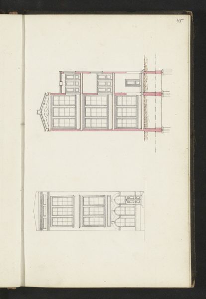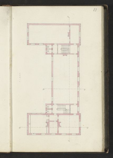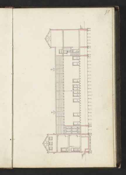 Curator: Looking at this delicate pencil drawing, "Doorsnede van een gebouw over de lengte," or "Section of a Building Lengthwise," created around 1864 by Willem Springer Jr., I immediately notice the almost ethereal quality. Editor: It's like seeing the ghost of a building! All these faint lines; you can feel the intention behind each careful stroke even though it’s rendered so minimally. What stands out to you? Curator: The geometric form itself is striking, presented with an architectural rigor, the cross-section reveals not just the structure, but how the inner spaces relate and function. Notice how line dominates; there's almost no shading, just pure form described by these delicate lines. Editor: I wonder about the social context. Who was this drawing intended for? An architect? A potential buyer? It feels like more than just a technical blueprint. It offers a glimpse into the ambition of that era. You know, to craft spaces that would resonate with individuals within an evolving urban sphere. Curator: Absolutely. It reveals the conceptual frameworks that determined their sense of aesthetics and social vision, what symbols of prosperity would need to be displayed, as well as status through formal space. Editor: It seems deliberately unostentatious, however, especially given the era. There's an emphasis on rationality and precision. Almost devoid of excessive ornamentation. Curator: Yet, it reflects, perhaps unintentionally, the deep cultural currents of its time. In its lines we trace social progress through the scientific progress exemplified through architectural drafting styles that communicate stability and order within the structures of emerging Dutch modernity. Editor: In its almost ghostly presence, it connects us to that ambition to craft buildings, and to me that speaks to the power of art's place within collective history, a whisper of design made visible today. Curator: Indeed, and for me, the work shows not only the vision of its time, but also the timelessness of pure form represented through this deceptively minimal medium, a reminder of how deeply symbolic architecture can be, communicating ideas far beyond its physical purpose.