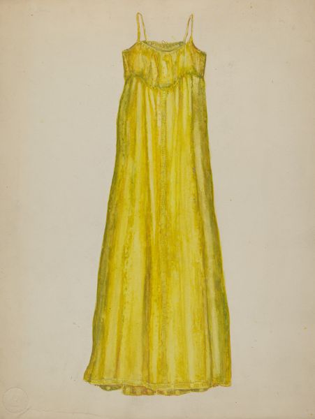 Editor: Here we have Erwin Schwabe’s watercolor and ink drawing, simply titled "Dress," created between 1935 and 1942. There's something so ethereal about it. It looks like a dress from a fairytale, maybe something Cinderella would wear. What are your thoughts when you look at it? Curator: Oh, it whispers stories, doesn't it? Schwabe wasn't just capturing a dress; he was channeling a mood, a yearning. See how the delicate watercolor bleeds, almost as if the dress itself is a memory fading into the page? Editor: Yes, it feels very delicate and ephemeral. Curator: Precisely! It's romanticism tinged with melancholy. Imagine the woman who might have worn it – what stories did *she* carry? Schwabe painted theatre sets and costumes. I suspect he’s asking us to consider dress as performance and symbol, a stand-in for something more. What do you think he is telling us? Editor: I never considered it like that; but now it’s so obvious. It is definitely representing a romanticized vision. Perhaps it’s less about the garment itself and more about the hopes and dreams it represents. Curator: Yes, beautifully put! It's a visual poem about longing. Perhaps, also a longing for the perceived golden age it evokes. Each carefully placed brushstroke is imbued with so much sentiment. Editor: That makes me see it differently now. I was caught up in the surface beauty. But understanding the sentiment behind it adds so much more depth. Curator: Exactly! Art, like dresses, has layers waiting to be uncovered!
