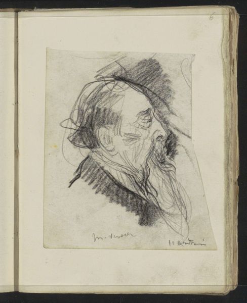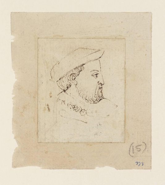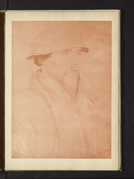 Curator: Welcome. Before us, we have what is catalogued as a phot reproduction of Hans Holbein's portrait of Thomas Wentworth, the 1st Baron Wentworth. The reproduction itself dates before 1877 and it’s held here at the Rijksmuseum. It's rendered in delicate lines. Editor: My first impression is that this image radiates a quiet nobility, even in reproduction. There's an intriguing melancholic cast to his gaze, which invites a deeper questioning of identity and status. Curator: Indeed. Notice the economical use of line, establishing form and volume with sparse yet confident strokes. The modeling is achieved through hatching, observing how the light plays across his features, and his impressive feathered hat. The technique directs us to the sitter’s inherent worth and, in its reliance on the Renaissance ideals of humanism, highlights Wentworth as an individual of notable bearing and significance. Editor: But beyond pure formalism, this work invites a closer interrogation. Wentworth was part of the aristocracy at a crucial moment. Power was shifting with the Reformation and class disparities were becoming increasingly stark. One has to wonder, who did this portrait serve? Who was meant to be reminded of Wentworth's rank and influence? Was this used in the maintenance of structural privilege? Curator: Your points bring forward essential socio-historical concerns, absolutely. Looking at the reproduction as it is here though, divorced from its original context and presented within museum walls, it stands as a testament to the enduring quality of Holbein's artistic method—the balance between form and the idealization of his sitter is captivating. Editor: Captivating, yes, but let's remember that these visual signifiers of power—the noble gaze, the fine attire—also played an active part in legitimizing inequity, something we are still grappling with today. Curator: It’s interesting how engaging with even this red-chalk reproduction of an earlier Holbein portrait opens pathways to reconsidering art historical, technical achievement as well as the weight of the social contexts it occupied. Editor: Agreed. To look closely at art, both for and beyond its intrinsic aesthetic value, ensures that history continues to be a relevant tool in assessing our current conditions.