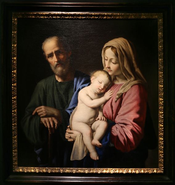 Giovanni Biliverti painted The Holy Family sometime between 1585 and 1644, a period defined by the tensions of the Counter-Reformation and the rise of Baroque art. The painting offers a glimpse into the domestic sphere, but challenges traditional representations of the Holy Family. Biliverti brings a sense of lived experience into the sacred narrative. Look at the figures surrounding Mary and Jesus. They appear to be in various states of health. The figure to the left seems aged, worn by the toils of life, but the tenderness in her gaze as she offers flowers is palpable. The artist's use of light and shadow invites the viewer to contemplate the complex realities of family life, including the emotional bonds that sustain them. The painting does not shy away from showing us that families, even the Holy Family, live lives of hard work and sacrifice. The composition asks us to reflect on the humanity of religious figures.