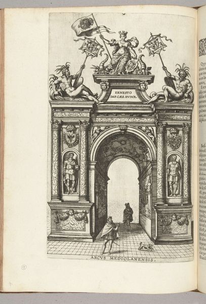 Editor: This engraving by Pieter van der Borcht I, made around 1594, is titled "Triomfboog ter ere van de stad (achterzijde)," or "Triumphal Arch in honor of the city (rear)." The composition feels very staged and theatrical, even performative. What do you see in this piece? Curator: What I see is a meticulously crafted piece of propaganda. Triumphal arches were potent symbols, often erected for victorious leaders or to commemorate significant events. The inscription "ERIGIS ERNESTO" points to its dedication to a figure of power, likely Archduke Ernest of Austria. This arch becomes a stage for legitimizing power, particularly at a time of political upheaval and religious conflict in the Netherlands. The arch’s function exceeds aesthetics; it acts as a political instrument, designed to shape public perception and cement authority. How do the surrounding emblems, like the crane and entwined snakes, inform this triumphalist narrative? Editor: I hadn't really considered the dedication as having such an agenda, more than celebrating a moment in history. With these lenses in mind, the presence of cherubs and heraldic symbols suggests an effort to enshrine this ruler. Curator: Exactly. They operate as a carefully constructed image that invites interrogation. Who does this arch really serve, and whose narrative does it exclude or suppress? Think about the architectural context too: arches often connect disparate spaces and groups. Consider the people walking through the arch in the engraving, presumably subjects of the archduke, what feelings are conveyed as they approach. Editor: Looking at it now, it feels less like a celebration and more like a statement of dominance. It almost seems imposing in light of this intention, I can understand the history of trauma behind celebratory events with similar underlying intentions. Curator: Indeed. Analyzing the intersection of art, power, and social context allows us to recognize how visual culture operates within systems of control. Understanding that can affect the viewers' own relationship with contemporary power structures. Editor: I see, approaching art history with this perspective makes the artwork less about aesthetic appeal and more about broader narratives concerning historical politics and culture. I will have to bring that knowledge with me!
