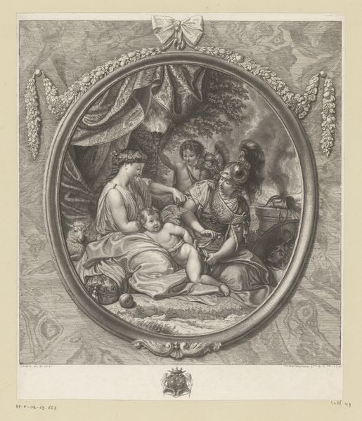 Editor: Here we have "Aankondiging van de geboorte van Maria" or "The Annunciation of the Birth of Mary", an engraving made between 1765 and 1770. It has an old engraving style, seemingly baroque, and is displayed here at the Rijksmuseum. It feels very structured, like a carefully staged scene. What do you make of the composition, the organization of figures and space in this print? Curator: The first thing to note is how Nilson organizes the scene through the interplay of light and shadow, directing the eye strategically. The stark contrast heightens the drama inherent to the narrative and adds visual interest to the print, particularly with the glow and shading across each figure. Note too, the figures occupy different visual planes within the frame, an emphasis on layering. How do you think this structure guides our reading of the print? Editor: I think that our eyes are drawn, or ascend, upwards following this deliberate play with perspective and depth of field from bottom to top? Do the semiotic or iconographic symbols, for example the lamb in the lower right corner, and letter M in the upper portion have meaning here too, beyond mere representational content? Curator: Precisely. These details add a rich dimension of symbolism and meaning. Think about how these choices, and their deliberate arrangement within the pictorial space, reinforce particular themes in Nilson's construction. He seems preoccupied with establishing a formal order reflective of the image content itself. Editor: So the artwork then acts as an organized visual system with carefully positioned figures and symbols contributing to this artistic system that supports the religious and allegorical message? Curator: Exactly. By examining the structure and visual choices, we can interpret how meaning is encoded within this visual representation of a narrative moment, moving beyond merely documenting historical themes, as such, but reflecting meaning using its aesthetic elements as building blocks. Editor: That’s a different perspective. Thank you, this helps me understand formal analysis better.