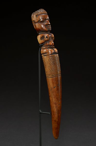 Curator: The stillness of this sculpture strikes me first. It’s so contained. Editor: This is “Ritual Head,” created by a Hemba artist, likely sometime in the mid to late 19th century. The piece, housed here at the Art Institute of Chicago, combines carved wood with what appears to be animal fur. Considering that, and the title, what do you read into its ritualistic power? Curator: Power certainly resides here. The wood, polished and smooth, contrasts vividly with the untamed fur. I am curious about the figure's gaze – almost closed eyes suggests contemplation, a turning inward. What sociopolitical narratives do you feel are wrapped up in the Hemba use of these ritual objects, considering their location, purpose, and relationship to governance? Editor: We understand that objects like this played a significant role in Hemba ancestor veneration, where they served as conduits between the living and the departed. They were essential to legitimizing authority within the community, functioning as emblems of leadership and spiritual guidance. This specific head has all of the characteristic Hemba idealized features. The downcast eyes that you noticed were possibly supposed to signal a certain degree of respect to elders and power holders. The fur piece would have been chosen deliberately for its totemic link with a key ancestral figure, as well. Curator: The layered textures offer a compelling contrast. Wood represents refined, human artistry, while the raw fur reminds us of our ties to the natural world. The sculpture challenges binary oppositions such as civilization versus nature and the sacred and the profane by weaving together contrasting components and imbuing it with ancestral spirit. Editor: That’s a wonderful insight. To extend your analysis, consider the sculpture’s display history. It shifts the power dynamics depending on whether it resides in a private collection, a national museum, or a sacred Hemba space. The meaning, intention, and role of a cultural object will change in line with location and context. Curator: Right. We can't divorce the piece from its cultural origins and how that intersects with power, representation, and identity in museums like this. Seeing it here in Chicago reshapes the narrative, prompting fresh conversations about our colonial legacies. Editor: Exactly. Viewing it in this manner adds an additional stratum to its narrative. Food for thought, indeed.
