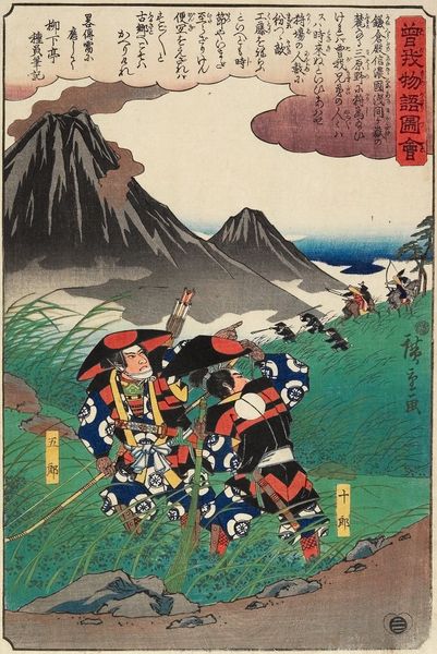Curator: This vertical triptych by Utagawa Hiroshige, likely created in the 1850s, depicts a Pilgrimage to the Unveiling of Benzaiten at Enoshima. Notice the caves by the main shrine. Editor: It's like a dream! Those mountains look so imposing, and the pilgrims feel both reverent and festive. The little details, the umbrellas...it's gorgeous. Curator: Indeed. Benzaiten is often associated with water, music, and wealth. Pilgrimages to sites like Enoshima were significant events. The rocky landscape itself becomes symbolic. Editor: The composition is so striking, with those looming rock formations and the tiny figures. A reminder of humanity's place in the face of nature's power, but also its beauty. Curator: Precisely. One can see the interplay of Shinto and Buddhist imagery, reflecting the syncretic religious practices of the time. Pilgrimage, a symbolic journey towards enlightenment. Editor: I'm struck by how much it speaks to journeys, both physical and spiritual. It is as if we're invited to join the procession into the unknown and to find something transformative.