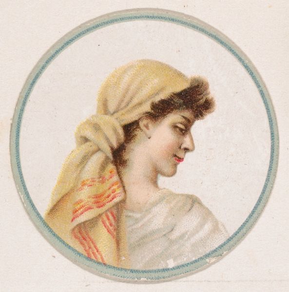 Curator: Here we have "Portrait of woman, from the Novelties series (N228, Type 2) issued by Kinney Bros.," dating to 1889. It's currently held at the Metropolitan Museum of Art. Editor: She's…striking. A certain vulnerability, perhaps? The circular frame gives it an intimate, locket-like feel. And what is it, some kind of lithograph? The dot matrix is quite visible. Curator: Yes, exactly! These cards were chromolithographs distributed by the Kinney Brothers Tobacco Company. Advertising ephemera really, aiming to make their brand synonymous with ideals of beauty. Editor: So, mass-produced. And yet, I can’t shake the sense of handcraft. Look at how the printed image almost simulates the blush on her cheeks. How do you see that playing out in consumption and culture? Curator: Mass production allowed this image and those ideals to be spread widely, normalizing specific aesthetics but it also created accessibility for the working classes and expanded advertising. A democratization of sorts… Editor: A complicated one, wouldn’t you say? The labor needed to produce these! Was it piece-work? Paid fairly? And of course, what’s the link to the Kinney Brothers’ manufacturing and sourcing of the tobacco? We must see that in the materiality of this drawing. Curator: Of course, such business was linked to a much wider international context of production and circulation of raw materials—as well as all kinds of inequalities related to labor. These cards served to distract from some very troubling realities. Editor: Indeed. And the subject is depicted as a classic beauty…an upper class ideal type perhaps? What narrative does this invoke about its female subject? Curator: Precisely. These cards frequently depicted actresses or other prominent women to further cement these links between brand association and consumer aspiration and it also offers a study on shifting ideals about femininity at the time. Editor: Thanks. It leaves you wondering how her image becomes both commodity and cultural currency within the confines of its creation. Curator: A compelling example of how advertising becomes so enmeshed with art and society!