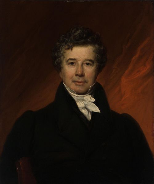This is Henry Raeburn’s portrait of Henry Mackenzie, painted with oils on canvas. The canvas is dominated by a stark contrast, with the subject emerging from an enveloping darkness. Light gently models Mackenzie’s face and the soft fabric of his cravat. Raeburn masterfully uses chiaroscuro, pulling the figure from obscurity, thus engaging with ideas of Enlightenment, where reason illuminates the darkness of ignorance. The subject's gaze is direct yet contemplative, drawing the viewer into a silent dialogue. The composition is simple but effective. The dark background, almost a void, emphasizes the figure's presence and focuses our attention on the face, which becomes a site of profound expressiveness. Raeburn's work here exemplifies how formal elements can create a portrait that transcends mere likeness.