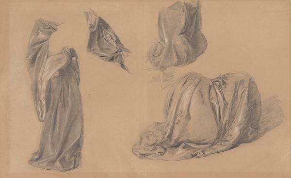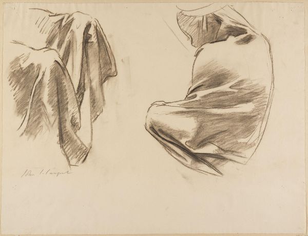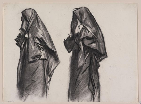 Curator: Here we have John Singer Sargent's drawing, "Bedouin Women," executed in charcoal around 1890. What's your initial response? Editor: Austere. It strikes me as less a depiction of women and more an arrangement of forms draped in shadow. Curator: Note how Sargent uses the charcoal to define volume and shape. Observe the interplay of light and shadow across the fabric, giving a sculptural presence to these figures. Editor: It’s clearly a study, looking at how fabric both conceals and reveals the body underneath. What kind of cloth is he depicting? Its drape and fall seem key to its meaning. Is it a locally sourced textile? I am fascinated by the craft here; by the weaving processes inherent in its very construction, lost to the casual viewer. Curator: Precisely! The veiling can be read as both a physical barrier and a potent signifier of cultural identity. Think about how he utilizes the very surface to convey texture; you almost feel the roughness of the material, its density playing against the lightness of the paper. Editor: Right. Sargent perhaps downplays individual personality and leans more toward portraying social and class roles through costume. One also wonders about the socio-economic implications related to access of certain materials. What dyes were used to make it that dark? Curator: An astute point. The limited palette contributes to the somber mood, but also underscores the formal concerns—the tonal variations are key to how we read the composition and understand its deeper meanings. Editor: Though presented as "high art," these materials carry embedded narratives that link the artwork back to realities of textile production and trade in the late 19th century. It forces me to see it less as portraiture and more a depiction of garment work of that era. Curator: Indeed. Whether study or statement, Sargent captures something profound in the silent monumentality of these figures. Editor: A compelling piece to think about what's not readily visible and acknowledge the production of artwork itself as form of material process.