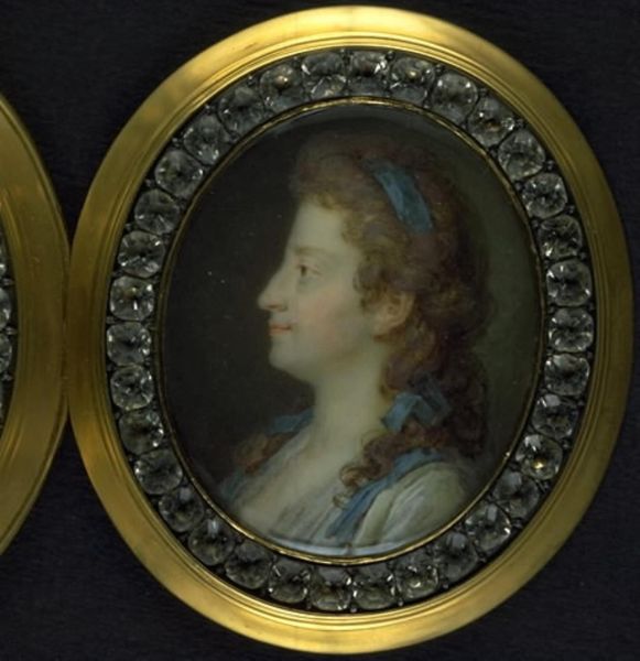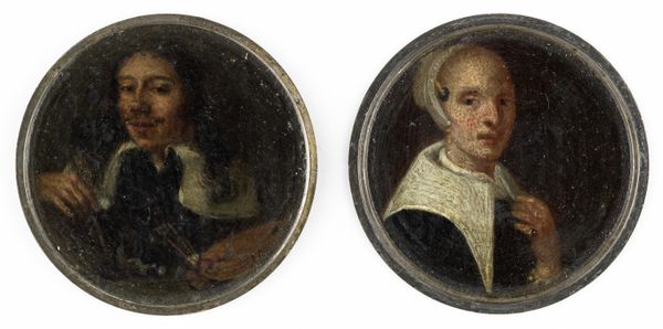 This is a diminutive self-portrait made by Balthasar Denner, sometime in the first half of the 18th century. Rendered in meticulous detail using watercolour on ivory, two oval portraits sit side by side: Denner to the left, and a female sitter to the right. The exquisite precision of Denner’s technique invites close scrutiny. The tight brushwork and smooth finish speak to the Enlightenment’s emphasis on empirical observation and scientific accuracy. Notice how the artist's focus is on capturing the minute textures of skin, hair, and fabric. The paired ovals, traditionally associated with pendants or lockets, evoke ideas about mirroring and duality. Here, the artist seems to be exploring not only likeness but also the philosophical implications of representation itself. Placed within the context of 18th-century debates about identity and perception, this self-portrait becomes a fascinating meditation on the act of seeing and being seen. We're left to consider the artist's intent and the cultural values embedded within this visually stunning object.