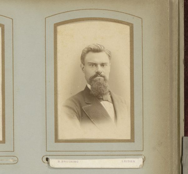 Curator: Here we have Louis Robert Werner's "Portret van een man met baard," taken between 1861 and 1866. It's a gelatin-silver print currently residing at the Rijksmuseum. Editor: It immediately strikes me as both intimate and strangely distanced. The sepia tone lends a sense of faded grandeur, but there's a stillness that almost feels haunting. Curator: The framing enhances that feeling. The oval shape, the tight composition focusing primarily on the man’s face and upper body—it emphasizes the formality inherent in portraiture, yet, as you note, creates a poignant sense of isolation. It’s quite formally arresting. Editor: Absolutely. And think about the labor involved in producing a gelatin-silver print at that time. Each step, from coating the glass plate to developing the image, was a physical process demanding expertise. There's a huge amount of technical effort there. Curator: Precisely, and that craft imbues the work with meaning. Consider also the light—how it models the man’s face, highlighting the texture of his beard, drawing attention to his eyes. This careful arrangement directs our gaze, subtly dictating the narrative. Editor: What I find fascinating is how this technology made portraiture available to a broader section of society. While painting was for the elite, photographic portraits offered a form of memorialization, a way to capture a likeness within a specific historical and social context. Curator: A fascinating observation. We can even analyze the signifiers embedded within the man's clothing. His jacket, waistcoat, the style of his beard—all contribute to a constructed identity, an attempt to present a particular image to posterity. Editor: And perhaps a romanticized image. There's an intentionality to the photographic portrait, a performance inherent in the act of being photographed. These early photographs document both a likeness and a complex web of societal forces that helped define how people sought to be seen. Curator: Indeed, thinking about these complex historical forces at play enriches the way we interpret and connect with the image. Editor: Reflecting on the materiality reminds us that art isn't just about representation, it is about process.
