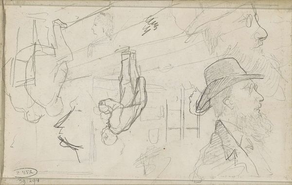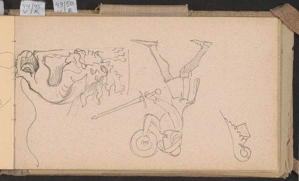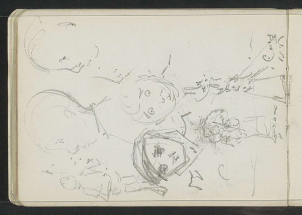 Curator: Here we have a sketch by George Hendrik Breitner, dating from around 1886 to 1890. It’s titled "Figuur met opgeheven armen en been," which translates to "Figure with Raised Arms and Leg." Executed in pencil on paper, it's currently held in the Rijksmuseum collection. Editor: My initial feeling? It’s raw. It feels almost like catching a fleeting thought—dynamic, spontaneous. Like someone jolted awake. Is it aggressive or triumphant, though? I can’t quite tell. Curator: I think that ambiguity is key. The raised arms and leg are gestures loaded with potential meanings—supplication, victory, perhaps even protest. Think of similar postures echoed in works throughout history—religious iconography or even political propaganda. Here, though, Breitner strips away the specificity. Editor: It's interesting how loose the lines are, how impressionistic. The lack of detail actually amplifies the emotional possibilities, doesn’t it? The viewer is almost forced to fill in the blanks, project their own interpretation onto the figure. Curator: Precisely. Breitner was known for capturing fleeting moments of everyday life, and that sense of immediacy extends here. Sketches like these offer a window into the artist's process, a glimpse into the genesis of an idea. The surrounding pencil strokes too seem to carry equal significance. What do you feel when you look at this landscape slash person? Editor: Hmm… it feels almost primal. Not polished and refined like his later works. Here, it's unburdened and intuitive. Also… slightly manic? But isn't all true creativity a bit like that, an ecstatic mess? Curator: The fact it comes from a sketchbook context enriches our understanding of Breitner's larger body of work. We see him experimenting, problem-solving. A private language is being expressed that opens out to more collective dimensions through this particular figurative configuration. Editor: Yeah, there's something strangely magnetic about witnessing someone work through their creative puzzles. The energy of the sketch somehow carries across time. Curator: A simple drawing. But filled with enduring potential. Editor: Agreed, like a seed containing a forest of feeling.