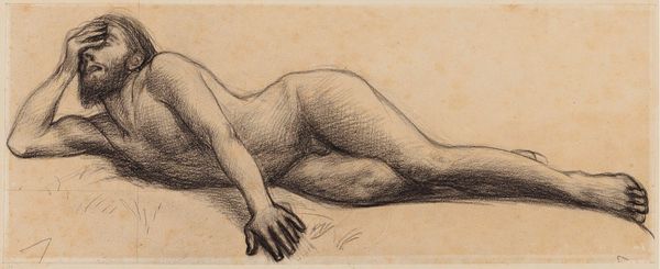 Editor: Pierre Puvis de Chavannes's "Femme nue allongée," created in 1879 using charcoal, presents a reclining nude figure. There's something incredibly vulnerable and almost melancholic about her posture. What strikes you most when you look at it? Curator: It's interesting you pick up on the vulnerability. This piece, situated within the academic tradition of its time, invites us to consider how women were being represented, or rather, *constructed,* for the male gaze. It makes me think about the power dynamics inherent in art production, specifically how the male artist often dictated the terms of female representation. Editor: So, you’re saying this isn't just a simple nude study? Curator: Exactly. Who benefits from this image, and what ideological work is it doing? Are we invited to admire beauty, or something else? Consider the context: late 19th century France, a society grappling with burgeoning feminist movements and evolving notions of female identity. How might this image be participating in—or pushing back against—these broader social changes? What do you think about the grid marks beneath the drawing itself? Editor: They show the artist’s process of measuring out proportions and scaling up from a smaller design perhaps, a typical element of academic studies? Curator: Yes, they demonstrate a technique but what does the technique create? Does the grid further objectify her or do they reveal that bodies and power can be scientifically “mapped” for visual capture? Editor: It gives a sense of objectivity that might actually remove something of the subject's humanity… Wow. I hadn't considered that perspective before! Curator: Right. By engaging with questions of power, gender, and representation, we can reveal deeper truths about the art object itself. The piece acts as an invitation to start conversations about larger sociohistorical and cultural frameworks, about who had agency when creating the work. Editor: I will never see nudes the same way!