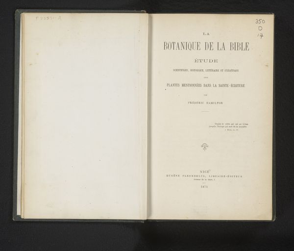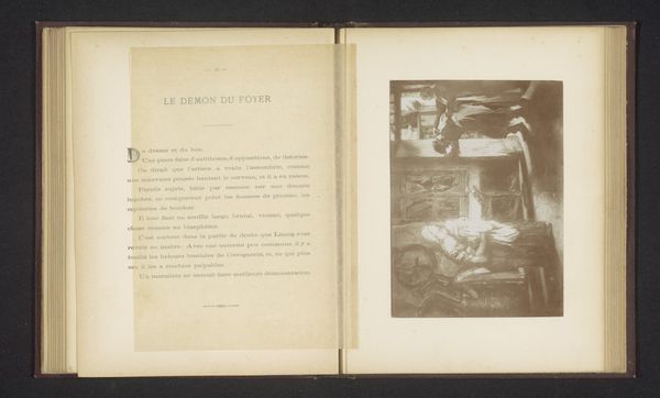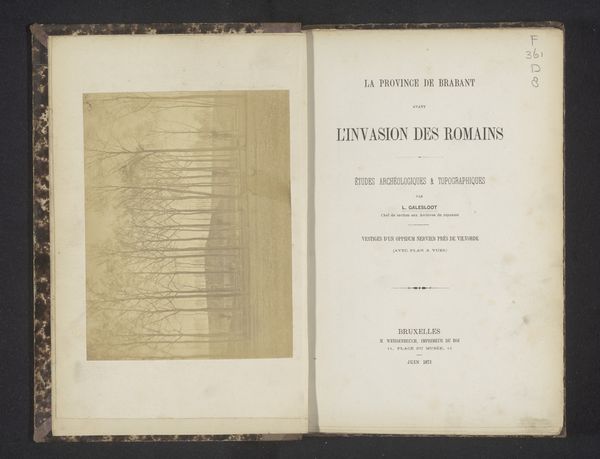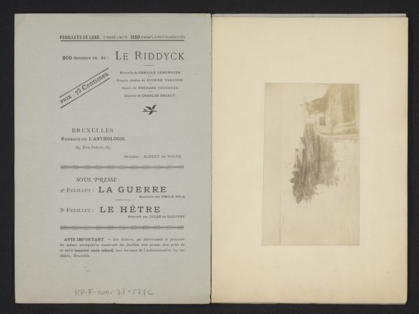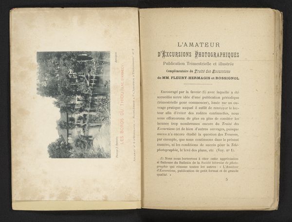 Curator: We are looking at a very interesting unbound print from 1882. The artwork, by J. Maton, is entitled "Un bois de la cambre à Anvers : aperçu sur les avantages et sur l'utilité de la transformation du domaine de Lipeloo en une promenade rurale." It consists of two facing pages, almost like an open book. Editor: The contrast immediately strikes me. The page on the right is dominated by text, imposing and almost clinical, while the left shows an image – a delicate, almost ethereal scene from within the woods. The sharp delineation makes me think about form and the structure of communication. Curator: It’s interesting that you mention “clinical,” as this piece exists as part of a larger history concerning urban planning and landscape architecture. The text actually outlines a proposal for converting an estate into a public rural promenade with a focus on Arboriculture. We’re witnessing the intersection of bureaucratic vision and its intended impact on public space. Editor: From a formal perspective, consider the type. It’s a very rigid typeface and structured in tiers, drawing the eye downwards. The opposing landscape photo is hazy, obscured, offering a recessive visual depth. This play on sharpness is deliberate, don't you think? Curator: Quite. The photography serves to romanticize the idea of the rural, while the print makes tangible its administrative backbone. Look at where it was printed, the Imprimerie Jos. Dorix, that really places this firmly within a historical context of publishing in Anvers. Editor: Also, notice the borders. The photographic page is clearly defined, sectioned off almost. Whereas the printed page just fades. This has a psychological implication—an enforced focus contrasting with boundlessness. The content acts second to how it is viewed. Curator: Indeed, the content takes a subservient position. It seems the print overall intends not simply to inform, but persuade and gain the audience's approval of city reform through textual design, carefully placed next to images with high appeal. Editor: And that hazy imagery...it hints at idealized, romantic views while the text delivers hard, unemotional facts. It’s a battle for our attention! Considering design techniques, how successfully would you rate the aesthetic persuasion used to influence social and political acceptance? Curator: Pretty efficient. Even in our contemporary setting, these layout devices still retain power over viewers. It makes us aware of how planning initiatives still depend upon such well planned, carefully placed rhetorical techniques. Editor: Fascinating how this single print prompts so much conversation even today, offering insights into our current day relationships. It demonstrates how successful manipulation techniques never fall victim to the decay of time.