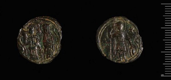 Curator: This is a coin issued during the reign of Constans II, part of the collection at the Harvard Art Museums. It's a small, but potent object. Editor: It feels quite worn, but still manages to convey power. There's a certain resilience that comes through, despite the patination. Curator: The coin's material, likely bronze, speaks to its intended purpose—mass production for trade and administrative function. Think about the labor involved in minting thousands of these! Editor: And its imagery offers insights into the ruling ideology and the role of the Emperor. Who is represented on the obverse and reverse, and what did those images mean to the people who used this currency? Curator: Exactly! The act of creating and circulating this coin reinforced existing power structures. Editor: Considering the context, this coin isn't just a piece of metal. It embodies complex social relationships and power dynamics within the Byzantine empire. Curator: Indeed, this small coin carries a weight of history and material significance. Editor: Examining it encourages a deeper understanding of the people and systems that brought it into existence.