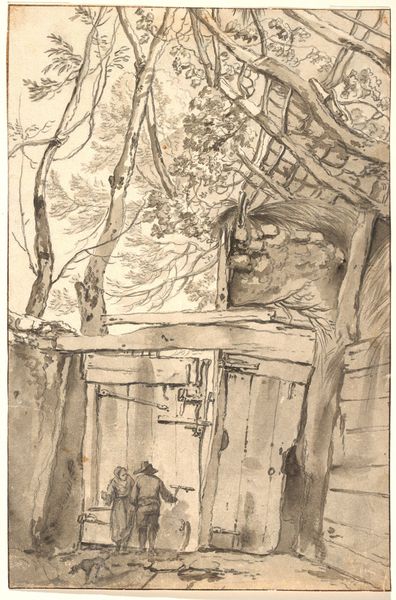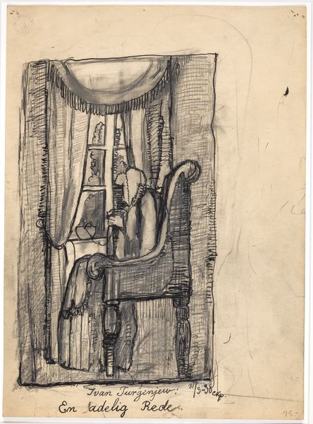 Curator: Immediately, I'm struck by the moodiness. It's a very enclosed, intimate space. Editor: Yes, the lighting definitely sets a tone. We're looking at a drawing in watercolor by Barbara Elisabeth van Houten, entitled "The studio of H.W. Mesdag, with two models of sailing ships," dating roughly between 1872 and 1950. Curator: It certainly captures the feeling of a working artist's space. The rough, almost unfinished quality adds to that immediacy. I can practically smell the oil paints! Editor: Consider the object on the bureau: models of sailing ships, almost like icons of artistic exploration. It hints at Mesdag's own celebrated maritime paintings. Perhaps these miniature vessels acted as a kind of visual shorthand, allowing him to study form and light without confronting the vastness of the open sea. Curator: And that’s an intriguing point about materiality: van Houten chose watercolor for what's fundamentally a workspace, maybe even an industrial one, where Mesdag labored on depictions of the sea! The ships embody how production intertwines art and craft; their delicate form reflects the work behind making something like that. Editor: It's compelling to see van Houten choosing an "intimism" aesthetic while picturing Mesdag’s workshop; she transforms a workspace dominated by labor into a place of private reflection and ingenuity, which imbues those maritime models atop the dresser with a layer of significance that connects us to the rich nautical imagery and historical symbols linked to the Netherlands, right? Curator: Precisely! The choice of watercolor creates a kind of softened gaze through which to explore the cultural production of maritime history that you speak of. By doing that it really encourages a reconsideration of the relationship between labour, material representation and individual artistry in a collective history of cultural making. Editor: Absolutely. It transforms this somewhat obscure corner of art history into a fascinating study in labor, artistry, and legacy, I think. Curator: And, viewed that way, it speaks volumes about the nature of creative inspiration, turning the mundane into the evocative.