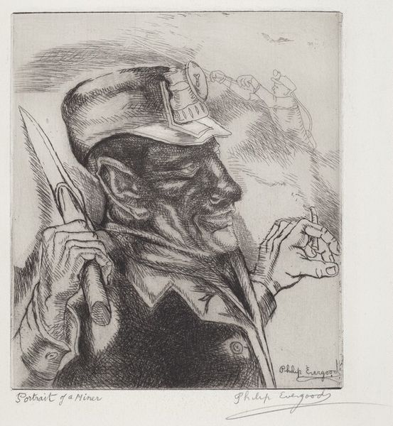 David Bekker made this drawing, titled "The Warrior," with what looks like charcoal or graphite, at some point in the first half of the 20th century. The marks here are so raw and immediate, you can almost feel Bekker’s hand moving across the page, wrestling with the image. The texture created by these marks is rough, almost sculptural. Look at the lines around the eyes—they’re not just describing the shape of the face, they’re digging into it, revealing something deeper. The black pigment has a subtle sheen in places, catching the light and giving the whole piece a kind of nervous energy. That cigarette dangling from the warrior's mouth? It’s like a punctuation mark, adding a touch of defiance to his expression. This piece reminds me a little of Käthe Kollwitz's prints, that same unflinching gaze and commitment to portraying human struggle. But Bekker's mark-making feels even more frenetic, like he’s trying to capture a fleeting moment of truth before it vanishes. What is it to be a warrior? Is it strength, or is it perseverance? Ultimately the work is about the openness and the possibility of the medium.