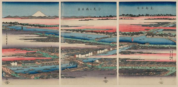 Editor: This is “View of the Yokohama Pleasure Quarters of Kanagawa at Cherry Blossom Time,” a woodblock print by Utagawa Sadahide from 1860. The detail is amazing; you can almost hear the bustle of the figures crossing the bridge, framed by the delicate pink of the cherry blossoms. How do you interpret this piece? Curator: It's fascinating to consider this work as a window into a very specific moment in Japanese history, a moment of intense cultural negotiation. The print depicts Yokohama, a port city newly opened to foreign trade. Note the title itself; is it simply descriptive or also suggestive of a specific framing, especially considering the "pleasure quarters?" Editor: That’s interesting… a framing? Curator: Yes, the "pleasure quarters," in reality, functioned as a liminal space where cultural exchange occurred, though within deeply unequal power dynamics. Sadahide’s work then can be seen as more than just a landscape; it’s a representation of Japan grappling with its identity amidst increasing Western influence. The cherry blossoms, symbols of transient beauty, juxtapose against the implied permanence of foreign presence. What is being said about these transient pleasures within a changing landscape? Editor: So the beauty is almost a commentary on something bigger? Curator: Precisely. Think about the composition too: the elevated perspective gives a sense of control, but who really holds that control? Is it the artist, the viewer, the Japanese government, or the foreign powers exerting influence? And what narrative are they trying to craft in the process? Editor: I see... it makes you wonder what was left *out* of the frame as well. It definitely makes me look at it differently! Thanks! Curator: Indeed. Art like this allows us to understand how visual culture can negotiate identity and power within significant moments of societal transformation, inviting a critical engagement with both past and present narratives.