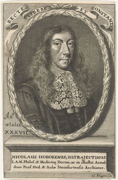 This is Reinier Vinkeles’s portrait of Willem Roukens, made with etching. Notice how Vinkeles meticulously uses line and texture to create a study in contrasts. Roukens is framed by two distinct shapes—an oval containing the portrait and a rectangle below with an inscription. The oval softens the rigid formality of the subject, while the rectangle anchors the piece, providing a structured base. Vinkeles plays with light and shadow through dense and sparse line work; the face of Roukens is subtly lit, drawing our attention to his expression. Consider the semiotic weight of the wig—a signifier of status and intellect in the period. The lace jabot at his neck further reinforces the textures and patterns within the formal composition. In paying such close attention to detail, Vinkeles suggests an engagement with broader cultural codes about the importance of social roles and civic duty.