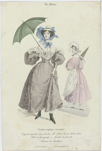 Editor: Here we have Elisabeth Barbara Schmetterling's 1832 lithograph, "Two Young Women in Summer Dresses." It’s quite striking how much fabric went into those sleeves and skirts. What story do you think this image is trying to tell? Curator: This image speaks volumes about the societal constraints and performative aspects of femininity in the 19th century. Consider how fashion functioned then—these dresses weren’t just garments; they were signifiers of social standing, wealth, and perhaps even a woman's perceived virtue. What does it mean to display yourself in this manner? Editor: It looks almost like a uniform, defining their role. The woman with the umbrella seems much more aware of being looked at. Curator: Exactly! Her gaze and posture suggest an understanding of the power dynamics at play. The umbrella isn't just for sun protection; it's a prop in a performance of bourgeois identity. But also note the other figure, seemingly turning away. Does that communicate a different narrative for her social standing or personal agency? Editor: Perhaps less interest in playing the expected role? Or shyness, maybe? It makes me wonder about the pressure to conform, and if resisting that was even possible. Curator: Precisely! Schmetterling's work offers us a glimpse into these complexities, prompting us to question how women navigated social expectations and asserted their identities, even through the seemingly innocuous act of choosing what to wear. And the restriction and limitation on choice... Who made those choices and why? Editor: That's a powerful reading. I'll never look at a historical dress the same way again! Curator: Hopefully! Art provides insight into identity that goes well beneath the surface.