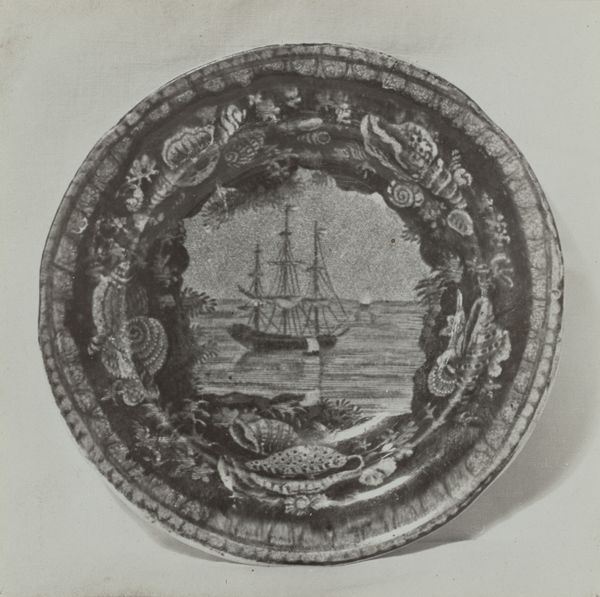 Editor: Here we have "The Campus Plate" made around 1936. It appears to be a ceramic plate decorated with a maritime scene, maybe using drawing and print techniques. There’s something quaint and nostalgic about it. How do you interpret this piece? Curator: Ah, yes. At first glance, it's a decorative object, seemingly innocent. But plates, especially historical ones like this, are storytellers. Imagine this gracing a college dining hall—the *Campus* plate! The scene evokes a sense of adventure, trade, and perhaps even colonialism. The ship signifies exploration, but who benefits from that exploration? Are those chaps on the shore looking for adventure or resources? Editor: That’s a really interesting point! I was so focused on the pretty decorative details I didn’t think about it critically. Is the shell border symbolic, too? Curator: Shells! Indeed! What are *they* doing there? Besides the pure joy of pattern and repetition and evoking the beach… well, think about what a shell protects and contains. Maybe it hints at precious resources being shipped? Or protection? Now, imagine those students, eating their humble lunch off of this fancy plate. What’s sinking in? The picture or the plate or the food? Editor: So it’s about more than just pretty design; it prompts consideration about themes of exploration, resource extraction, or something else, on a grander scale, embedded in this plate. I never would have seen that! Curator: Precisely! Art's like that…a hidden trove. Everything about a piece, no matter how subtle, might hold significance if you start digging around. Food for thought for our tummies *and* our brains.