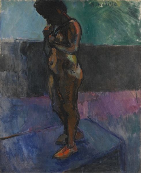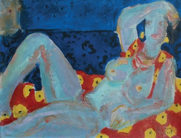 Curator: Gazmend Freitag’s “The Green Stockings,” realized in 2012, immediately strikes me with its bold and visceral quality. What’s your initial reaction? Editor: Intense. The colours are doing so much, particularly that turquoise background against the earthy tones of the figure. There’s a raw sensuality, almost confrontational in its directness. Curator: Precisely! Freitag works here in a mode that strongly evokes the Neo-Expressionist movement. Considering the art historical and social moment from which it emerges, we must remember the figurative painting revival it mounted as resistance to Minimalism. What do you see here of the politics of figuration? Editor: Absolutely, there’s a reclaiming of the body. You see how Freitag uses a female nude, situating this painting in an art historical canon that traditionally presented the female body as an object. However, there is agency here in the composition—how the figure is framed. She’s not passively on display. Her gaze, although obscured, demands consideration. I also note that title -- “The Green Stockings”. This directs us. What significance does clothing play in the performance of identity, gender, sexuality? Curator: Fascinating point about the title’s provocation. Looking at Freitag's technical approach, we observe impasto layering, visible brushstrokes – very characteristic of Expressionism. The textured surfaces are far from photographic smoothness, suggesting something beyond pure mimesis, pointing towards inner states perhaps. The visible traces of the artist's hand push back against any easy sense of commodification or frictionless viewing of the body. Editor: Agreed. This raw handling allows for layers of meaning, it disrupts a clean, easy read of the subject and instead complicates ideas around objectification and spectatorship, allowing us to view the subject through a lens of identity politics. This allows for deeper conversation. Curator: It's interesting how Freitag uses what at first appears like conventional art-historical genre — the nude — and yet through colour choices and the active paint surface and provocative naming destabilizes any straightforward interpretation. It creates room for dialogue about the body, its representations, and social contexts. Editor: It reminds us that what is presented on the canvas, even in familiar forms like the nude, can be a space to reconsider entrenched notions about gender, representation, and power. Curator: Yes, a vital reminder that echoes still in current debates on contemporary art! Editor: Indeed. A piece that proves beauty lies in these layers of narrative, friction, and engagement.