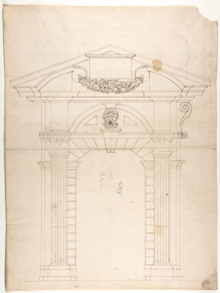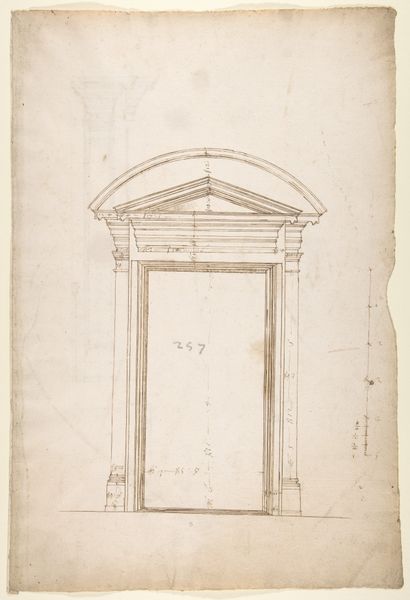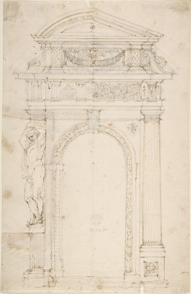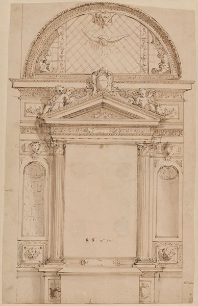 Editor: This is "Design for a Wall Tomb," a 16th-century drawing of architecture. It seems pretty formal. It makes me think about monuments and remembrance, but in a very staged and designed way. What do you make of it? Curator: It is indeed a fascinating reflection of its time. Notice how the tomb design employs classical architectural elements - columns, arches, and decorative carvings? During the Renaissance, there was a real resurgence of interest in classical antiquity, which dramatically influenced artistic and architectural styles. In whose image, and with what purposes in mind, are these public facing symbols displayed? Editor: So, this isn't just about aesthetics, but about using visual language to communicate certain ideas about the person being memorialized? Curator: Precisely! This drawing speaks to how power and status were visually constructed. Consider the tomb's intended location. Would it have been placed in a prominent public space like a church, or within a private family chapel? How might location impact our understanding of its purpose? Editor: A public space would definitely make it about a wider audience, solidifying the family's status in the community, wouldn't it? Curator: Exactly! The Renaissance saw the rise of powerful families who used art as a way to legitimize and broadcast their power. Tombs became statements, showcasing wealth and lineage through carefully chosen iconography. Editor: It's incredible to think about how something like tomb design could be so politically charged! I will definitely consider placement more critically from now on. Curator: Art, even something seemingly simple, never exists in a vacuum, right? And recognizing those underlying societal narratives can enrich our understanding so profoundly.