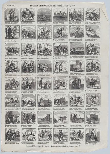 Editor: This is "Broadside with 48 scenes showing extravagances of the world," made between 1855 and 1865. It's a print—etching and engraving—by Juan Llorens, at the Metropolitan Museum of Art. There’s so much to look at! It reminds me a bit of a cartoon strip, with all these tiny scenes. What do you see in it? Curator: It is indeed a rich tapestry of social commentary, echoing the visual language of its time. What strikes me is how it uses the symbolic weight of everyday scenarios to critique societal "extravagances." Consider the image's repetitive structure, where each frame becomes a microcosm reflecting larger cultural trends. Have you considered the emotional through-line? Editor: I guess each scene is like a little story, and together they build a bigger picture… sort of a commentary on life at the time? But it is a comic. What symbols were commonly understood back then that we might be missing now? Curator: Precisely. These scenes leverage shared cultural memories, understood instantly by the contemporary viewer. Look at the recurring motifs—leisure, commerce, domestic life. What narrative do these scenes construct? Think about how it reflects broader concerns about wealth, status, and moral values during this historical moment. Each character, action, or location becomes imbued with connotative meaning that reinforces or subverts contemporary cultural norms. Editor: That's helpful – the cultural context is key. It is interesting how even a funny comic drawing like this reveals those serious social considerations! Curator: Yes, each image operates on multiple layers—offering humorous observations, yet subtly reinforcing established ideologies. Studying images as carrier of emotions helps understand people across different times. Editor: It’s amazing how much you can learn from what at first just looks like a cartoon! Thank you!