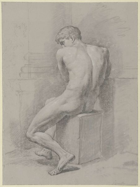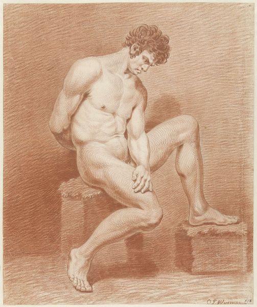 Eugène Delacroix created this Male Academy Figure using brown wash on paper, a traditional medium and method for academic study. The sepia wash, applied in layers, builds up the figure's muscular form and contours, giving weight and depth to the subject. The artist has paid close attention to the play of light and shadow on the model's body, rendered through subtle gradations of tone. The layered brushstrokes and the way the wash settles into the paper create a sense of texture, enhancing the three-dimensionality of the figure. But beyond the artistic skill on display, it is important to reflect on the wider social and economic implications of this type of work. The 'academy figure' was a staple of artistic training in the 19th century, with artists honing their craft by drawing or painting live models. This raises questions about labor, class, and the commodification of the human body. Understanding the materials and processes behind this artwork invites us to look beyond the surface and consider the broader cultural context in which it was made.