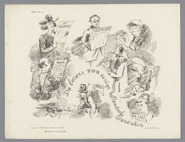 Curator: We are looking at "A Happy New Year," a pen drawing by Edwin Austin Abbey, likely created between 1900 and 1910. What strikes you first about this piece? Editor: Well, the simplicity of the line work jumps out. It's almost a casual sketch, focusing on the labor involved with hand drawn holiday greetings. Look at how economic the artist is in describing the figure. Curator: Indeed. Abbey was an established illustrator. Here, he appears to be poking fun at the genre of commercial illustration he knew so well. It is a rare glance at the artistic practice itself, the commodification of festive cheer. Editor: Exactly. And what material implications are hidden within a gesture such as a drawing shared between close family? Consider the production process. What sort of paper was this sketched onto? How widely would drawings like this be shared? These are all interesting, if mundane, questions about material and production. Curator: Also, observe the directness of the title written above. “A Happy New Year” doesn’t disguise its purpose. There's a charming honesty, particularly in its contrast to the slickness of mass-produced cards that were starting to gain traction. Editor: You’re right. But consider the context. What did it *mean* to send such an individualized hand drawing. It wasn’t merely decorative – it functioned within a nexus of artistic process, interpersonal relationship and gift giving. A store-bought postcard never shares these nuances. Curator: It really shows the complexity that is within such a simple creation. Editor: Precisely, every artwork serves many roles, with different materials having differing socio-political impacts. That's often disregarded in favour of purely formal art history. Curator: The work encourages reflection, not just on festive greetings, but on the role of the artist in their making. Editor: I would also argue the role of material conditions too! Thanks. Curator: Thanks.