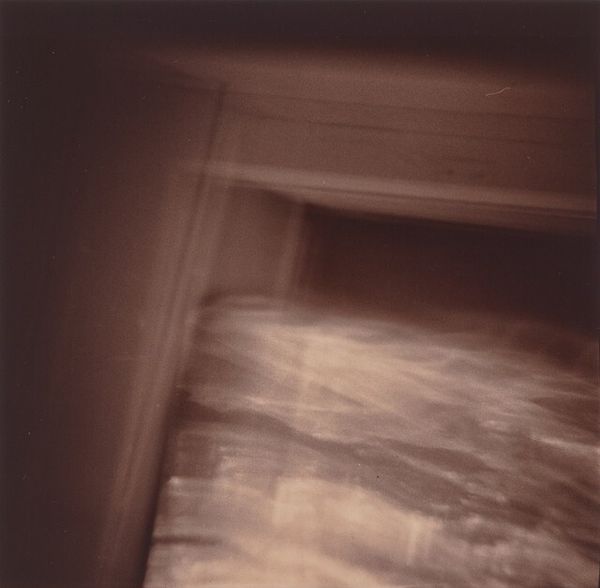 Editor: This is "Wall and Unmade Bed, Washington, D.C." a C-print photograph by Nancy Rexroth, taken in 1972. It’s... hazy, almost dreamlike, but also unsettling with its claustrophobic perspective. What catches your eye when you look at it? Curator: Immediately, I’m drawn to the liminal space – that sense of transition between the domestic, represented by the bed, and something more undefined, suggested by the wall. It’s blurred, yes, almost as if obscuring something…Do you see that horizon line, just barely there? What do you make of that? Editor: It makes me wonder what’s outside, or beyond. Like the bed is a safe space, and the world is out there. Curator: Precisely. The unmade bed carries potent psychological weight. Traditionally, the bed symbolizes rest, intimacy, but here it suggests vulnerability, perhaps even a disruption. It is a very common archetype in post-war art: think Tracey Emin's "My Bed", or Felix Gonzalez-Torres piles of candy or photographs. Those all ask us questions about loss and sexuality by subverting our ideas of what “domestic bliss” can be. Does the muted palette contribute, do you think? Editor: Definitely, it's not a cheerful picture. It feels faded and distant, almost like a memory. The colors remind me of old photographs or faded textiles. Curator: You are absolutely right! It speaks of lost memories or secrets that time and memory have distorted. And what about the decision to use C-print as a printing process? Editor: Good point! C-prints don't necessarily give an impression of timelessness! This actually feels quite modern. Curator: Rexroth is masterfully playing on themes related to mortality and intimacy through the universal symbol of "home." Do you see this too? Editor: I hadn't thought of it that way initially, but that totally makes sense. I see how she has taken that symbol, home, and made it uncanny. I find this very compelling, thanks! Curator: It is indeed a powerful comment about how our inner and outer worlds intertwine and change with time. Thank you for making such astute observations!
