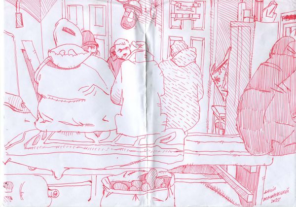 This Untitled drawing was created by Alevtyna Kakhidze using ink on paper. Kakhidze, a Ukranian artist, made this piece in response to the recent trend of cultural institutions cancelling Russian cultural figures, most prominently Tchaikovsky. This cultural phenomenon is a direct result of Russia's war in Ukraine, revealing the deeply political nature of art. Here Kakhidze seems to be grappling with the weight and meaning of Tchaikovsky’s presence in Ukrainian, and even global culture, and the emotional turmoil it can cause to reconcile loving an artist with denouncing his warmongering country. The red ink of the words "NOT CANCELED" and "CANCEL" stands out against the black ink drawings of the Russian composer at the piano, a person watching Tchaikovsky on TV, and what looks like a group of people protesting. Ultimately, this work conveys the personal and societal struggle many Ukrainians face when engaging with Russian culture today.