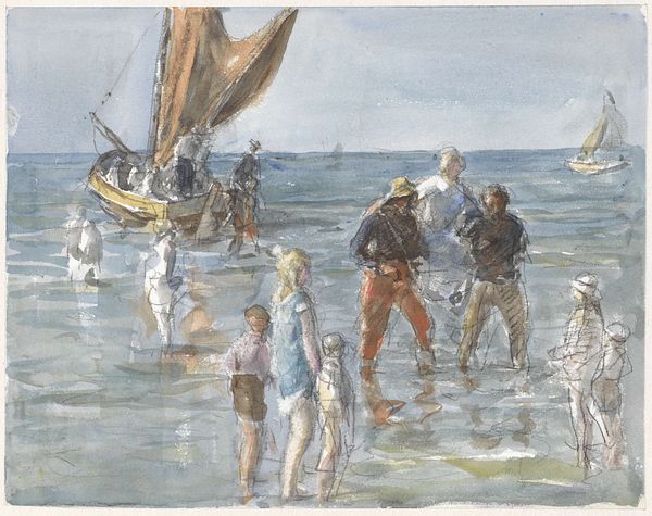 Curator: Winslow Homer's watercolor, "A Basket of Clams," completed in 1873, captures a seemingly simple seaside scene. What's your immediate read on it? Editor: It's striking how fleeting the moment feels, even permanent somehow. There's a vulnerability there; you can sense the summer heat, the dampness in the air. And the beached shark--what a symbol of life's impermanence. Curator: I'd say the painting gives a view into the era's societal norms around childhood. Genre scenes of children engaged in labor or play, became really common. Homer does show children interacting directly with their environment rather than idyllic landscapes Editor: Yes! And Homer really emphasizes their labor within the seaside world. Look how they engage with that stark image of that small beached shark! Children growing into their cultural relationship with both nature and their local economies. It’s so elemental. Curator: Right. Homer painted this just a few years after the Civil War. Representations of childhood took on additional layers of meaning, projecting hopes for national healing and renewal onto these small figures. Editor: The bare feet especially lend themselves to that idea of renewal: an almost Christ-like return to a simpler way of life. Consider also that single shark— it is a reference to life's precarity, but there is plenty here about continuity too. Curator: Indeed, the symbolism layered into Homer's choices encourages reflections on community identity in post-war America and the place of work itself. Editor: It shows, and makes the everyday almost sacred; it creates space to pause. Curator: Looking closely at the watercolor brushwork itself makes it hard to avoid seeing how the setting impacts the figures in the work. Homer shows just that type of human adaptation. Editor: Ultimately, it's a masterful watercolor about adaptation, isn't it? Adapting our symbols, and how we, too, survive on an elemental beach of meaning.
