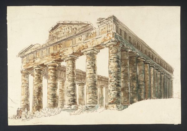 Curator: This watercolour, attributed to Ernesto Richter and titled "Exterior of the Temple of Vesta in Rome", invites us into a scene brimming with classical antiquity, dating from before 1907. Editor: My initial reaction is that it's rather serene. The gentle colours and meticulous detail give a tangible sense of reverence to these Roman ruins, making the artwork feel more real, as if capturing the mood and the moment rather than just representing buildings. Curator: Indeed. It's intriguing how Richter employs watercolour and tempera—humble, portable materials—to document such monumental structures. This speaks volumes about the accessibility and perhaps the democratization of art production in that era. Travel sketches like this were a product of their time, a pre-photographic method for representing landscapes. Editor: Look at how the light defines form, however! See the texture he creates on the pillars? He contrasts light and shadow that creates the sense of depth and volume; he uses simple artistic principles that transform the ordinary paper medium into the monumental space and the timeless aura of ancient Rome. Curator: Yet, that texture is crucial. The evident aging of the paper contributes to our understanding too, the wear mirroring the degradation of these architectural sites over time. The work on 'toned paper' adds depth to the composition as a whole, adding even more weight to Richter's craft. Editor: That layering effect, though! Look closer - the paper, the light, and then this very delicate linear structure on these aged surfaces! And that subtle, precise realism--that is a result of an understanding of form and light which transforms the work and is, for me, the core beauty. Curator: We’re perhaps witnessing a collision of industry and art. A world of increased movement due to advances in transportation made sights such as Rome accessible to new markets and new audiences; Richter provides them the ability to bring art, architecture and travel all under one roof. Editor: It brings a contemplative spirit in a way. And really encourages us to examine the artwork as a moment frozen in time: it highlights the intersection between perception, technique, history, and architecture; how all elements build this fascinating dialogue, the harmony between our vision and ancient echoes that are reflected. Curator: I completely agree, an elegant reminder of the ways in which simple acts of creation become testaments of our social worlds, too. Editor: Absolutely; each line tells a story, layering not just technique but inviting a profound and multifaceted appreciation for visual storytelling.
