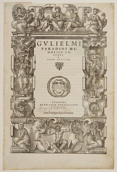 Editor: This is a title page from 1565 for Galen's *Librorum Septima Classis*. The artist is unknown. It's an intricate border surrounding the text with scenes of healing. What draws your eye when you look at its composition? Curator: Note the balanced, symmetrical structure. The four blocks, two on each side, create a visual rhythm. How does the artist's use of line weight affect the overall impression? Editor: The varying line weights add depth. The thicker lines create darker areas, adding contrast. Does this contrast enhance the formality of the piece? Curator: Indeed. And observe how the Giunta mark centers the composition, acting as a focal point. The work masterfully balances detail and clarity. Editor: I see how all the elements create a harmonious visual experience, enhancing the text's presentation. Thank you.