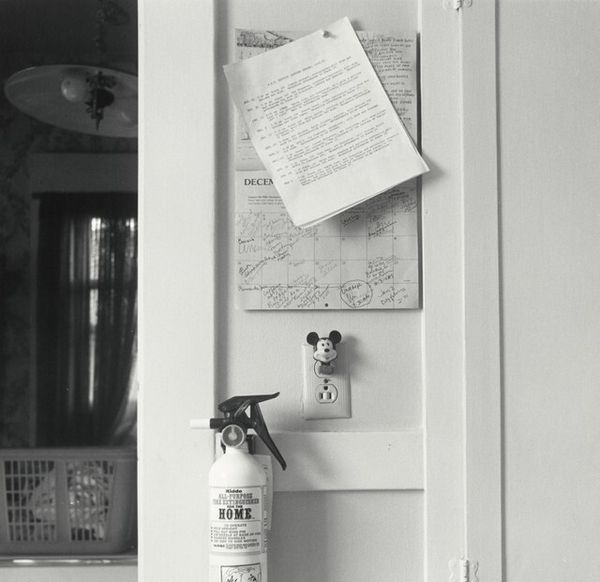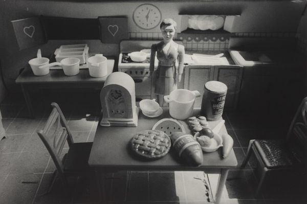 Curator: This is Joanne Leonard’s photograph, “Countertop with Premium Crackers and Pills–and Can Opener,” taken around 1976. It offers such an intimate view, doesn’t it? Editor: Yes, an immediate impression is its rather stark domesticity. The muted tones and cluttered countertop evoke a very specific era of mid-century kitchens. There is almost a sense of... melancholic constraint about it? Curator: Constraint, interesting. To me, the arrangement feels symbolic, particularly how the artist places these objects together: the "Premium" crackers, the assorted pills, the ever-present can opener, which is almost an archaic tool today. Each item seems chosen to represent a stage or necessity in daily life. Editor: Precisely. Think about what "premium" implies. A status symbol of accessible wealth is ironically juxtaposed with a row of medicine bottles and tablets. It’s commenting, perhaps, on the pressures on women, the silent epidemic of medicating daily struggles in the home during that period. The crackers could represent the idealized happy home that’s deceptively bland. Curator: That reading resonates. Leonard was active in the feminist art movement, so placing emphasis on these overlooked spaces and objects holds a deeper cultural significance. Even the modest window treatment provides a sense of enforced domesticity, as the window opens not on freedom, but rather, just more of a contained space. Editor: It's impossible to ignore how gender dynamics shaped even mundane experiences within the home. Consider the placement of the can opener, a decidedly utilitarian item; its presence signals repetitive labor, mostly undertaken by women to maintain a home during that time. It is as if that one tool signifies that entire social script. Curator: And that visual anchor connects directly to today. We’re still interrogating assumptions about caregiving, medicine, and so-called “premium” living standards that hide so much. The enduring power comes through its candid, ordinary nature that feels quite radical now. Editor: I agree, recognizing those patterns matters, it allows us to reevaluate assumptions about how much has truly changed within gendered labor structures and societal expectations around well-being. It’s a humble photograph with powerful contemporary echoes.